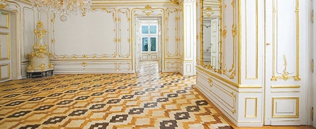 The White-and-Gold Room is situated on the ground floor of Schoenbrunn Palace. With its white-and-gold-panelled walls and varying rocaille décor it is an outstanding example of Rococo craftsmanship from the era of Maria Theresa. During the restoration in the beginning of the 2000s, fragments of the original wooden flooring displaying an elaborate geometric pattern were discovered; the new floor was subsequently based on this historical model.