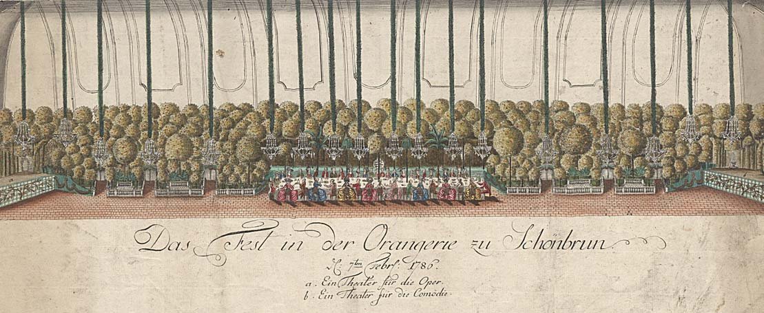 皇帝ヨーゼフ2世の時代、冬になると、今日と同じようにオランジェリーに鉢植え植物が集められ、祝宴用のテーブルセッティングが行われました。皇帝は、ロシア旅行中にサンクトペテルブルクで、このような祝宴に出席しました。1785年2月6日、皇帝ヨーゼフ2は、抽選で選ばれた貴族56名のために、祝宴用のテーブルを用意しました。招待された貴族のひとりは、 「厳しい冬でも、豪華に飾られたテーブルの上では、全季節の花が芳香を放ち、最高に美しい照明に照らされたビターオレンジとレモンの木が周囲に置かれていました。食事の後には、花で飾られた冬の間で、演劇と舞踏会で素晴らしいひと時を過ごしました」と感想を述べています。